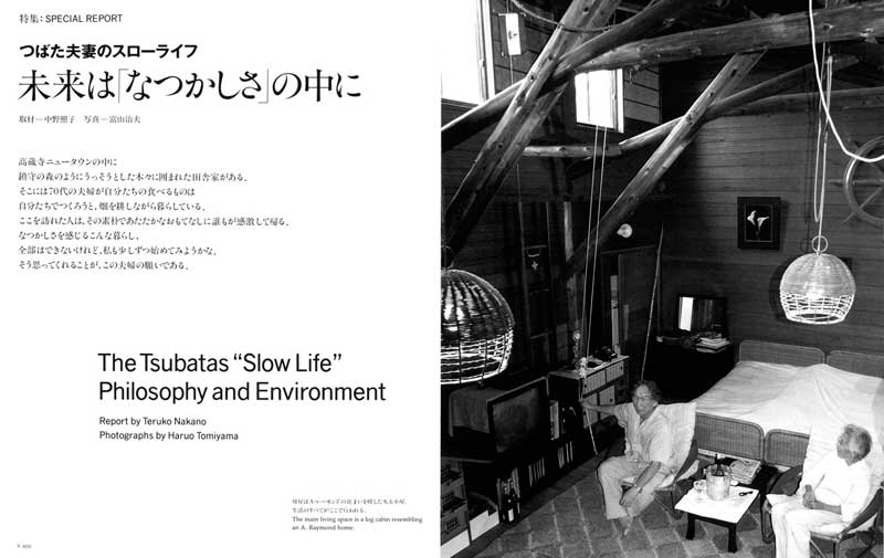 1960年代に計画された愛知県春日井市の高蔵寺ニュータウン。計画に参画しそこに暮らし続ける、つばた夫妻の住まいは300坪、丸太小屋の母屋に蔵と小屋があり、敷地の3分の2を畑が占める。21区画に分けた畑と周辺の樹木から、約120種もの野菜や果物が収穫できる。つばた夫妻のスローライフを紹介した(P14参照)。