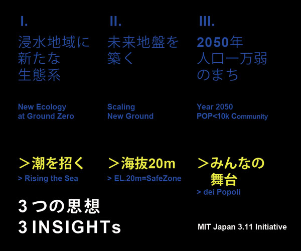 過去40年の間に、自然破壊を伴う開発によって、住居、及びそれに布設される道路、防潮堤、上下水道等が整備された。震災によって、中世、近代からはじまった、人口増加に伴う、湾の埋め立ての歴史は一気に消し去られ、土地の原風景が現れた。こうした地域インフラが消滅し、今、住民は防潮堤をはじめとする、再来する津波への対策方法の決断を迫られている。今回の津波の浸水範囲が、縄文時代から江戸時代までの海岸線と重なるという事実が、都市に焦点をあてた近代開発による復興の在り方に疑問を投げる。南三陸町の復興計画においては、海と陸を一体の自然として捉えることを原点とし、海側からの視点にたち、土地本来の性質を優先した環境共存の暮らしを再びかたちづくることが、災害に強い、持続可能性のある本質的な復興への大義となるだろう。
