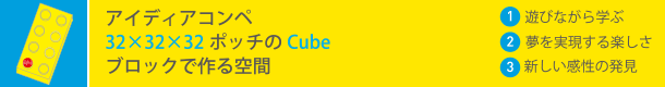 たとえば、レゴブロックでシマウマを作ろうと思ったら、限られ数と色の組み合わせで、すぐに手を動かしてシマウマに見立てたオブジェのアイディアが幾百も浮かび作ることが出来ます。このアイディアコンペは、これまでのレゴブロックの世界をちょっと飛び越えて、見立て、ではなく、レゴブロックを使った「空間」のアイディアを考えてみようというものです。32×32×32ポッチは約25センチの立方体Cubeの寸法です。そのCubeの中に「あなたが考える空間を創造してください。自由な発想を期待しています」という募集により160を超える応募がありました。また、同じ課題に取り組んでいただくアーティストや建築家や科学者をお招きし、作品を作っていただきました。自分の発想と比べて何が違うか、、、専門家の頭脳はどうなっているのか、それを感じることも楽しんでみよう、というものです。ここに集まった自由自在で発想豊かな作品をご覧ください。